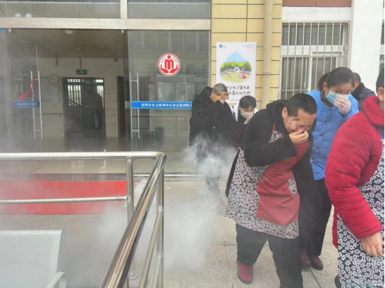 最后是疏散演练:假定分院一楼房间起火,听到报警后,职工立即按疏散预案,有条不紊地引导院民们进行疏散撤离。3分钟后,楼内人员全部成功撤离到安全地带。与此同时,灭火应急小组也第一时间赶往火灾发生点,迅速、熟练地使用灭火器对模拟火灾进行控制扑救。
